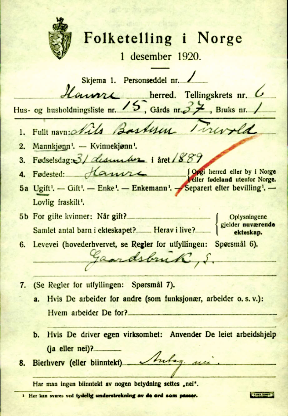 Då folketeljaren Einar Johannesen Raknes var oppom Tirevoll i 1920 fann han 5 personar der. Her er noko av det han noterte på personsetlane sine: